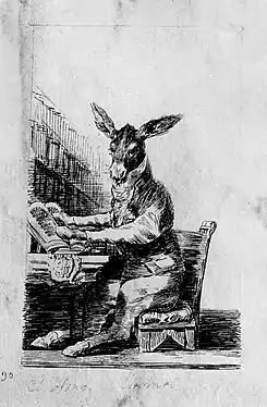 The print is a satire on the Spanish nobility's obsession with ancestry and genealogical trees, and suggests that foolishness rather than nobility is hereditary. In particular, some[3] have suggested that the print is aimed at the infamous politician Manuel Godoy, the prince of peace, who justified his rapid climb through the Spanish establishment by claiming descent from the Gothic kings of Spain. The use of a donkey to satirize the aristocracy was used on several of the Los caprichos prints.