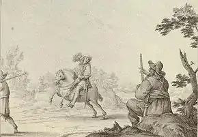 The remaining quarter of his drawings consist mainly of genre scenes: soldiers in action or satirical peasant figures engaging in activities such as singing, reading and smoking. It is believed that each of the figures represent one of the five senses. Examples are the three drawings in the Metropolitan Museum of Art in New York, which symbolize Hearing, Smell and Sight.[2]