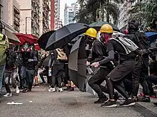 On 4 October 2019, the Government of Hong Kong invoked the rarely used colonial-era Emergency Regulations Ordinance to implement the Prohibition on Face Covering Regulation (PFCR), an anti-mask law[44] in response to the ongoing protest that year. The law bans protesters from covering their faces whether in full or partially during protests, including at rallies given a "Letter of No Objection" under the Public Order Ordinance.[45] Anyone who wears a mask at a lawful rally or march, unlawful or unauthorised assembly, or during a riot could be sentenced to up to a year in jail and a fine of HK$25,000. Exemptions include those at protests wearing masks for professional or paid work, or for religious or medical reasons.