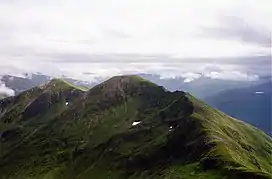 Aonach Meadhoin reaches a height of 1001 metres (3284 feet) and along with the Munros of Saileag and Sgùrr a' Bhealaich Dheirg it forms a group of mountains sometimes referred to as the North Glen Shiel Ridge.[2] The group are also known as the “Brothers of Kintail”[3] in a nodding acquaintance to the better known Five Sisters of Kintail just to the north west. The mountain's name translates from Gaelic as Middle Ridge,[4] the mountain is shaped like a horseshoe with the summit ridge lying centrally between the two ridges on either side of Coire na Cadha which lies between the mountain and the A87 road two kilometres to the south.