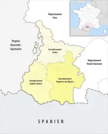 In 1800 the arrondissements of Tarbes, Argelès-Gazost and Bagnères-de-Bigorre were established. The arrondissement of Argelès-Gazost was disbanded in 1926, and restored in 1942.[3] In January 2017 13 communes passed from the arrondissement of Tarbes to the arrondissement of Bagnères-de-Bigorre.[4]