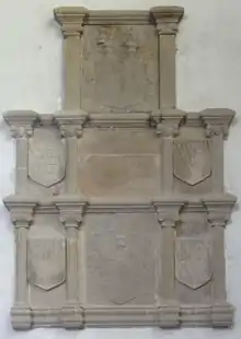 A late 16th century[20] stone heraldic mural monument of Richard Bellew of Ash survives in Braunton Church, on the south aisle wall. It is said to have been taken from the former chapel at Ash.[21] It is a triptych split by use of superimposed orders of short Ionic columns into three rows and seven compartments. Within six of the compartments are escutcheons with heraldry sculpted in relief. The painted inscription and all painted colouring have been lost. It shows Richard's own shield at bottom centre, that of his father at top and on both sides in total 4 further shields of his father (again), grandfather, great-grandfather and great-great-grandfather.