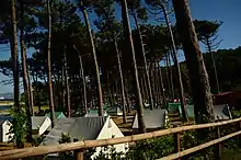 During the summer, daily boats link Cíes with the ports of Vigo, Baiona and Cangas, and Ons with Portonovo, Sanxenxo, Bueu, Marín and Pontevedra. Daily affluence is limited and all visitors are required to previously book an authorization request from the Galician Government.[17] In Cíes there is a camping area but permissions have to be reserved at the Vigo port. Access to Salvora and Cortegada is more restricted, requiring organized visits.[18] There are no waste bins on the islands. Visitors are required to take their litter back to the mainland.