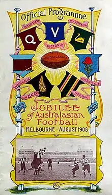 Clubs began touring the colonies in the late 1870s, and in 1879 the first intercolonial match took place in Melbourne between Victoria and South Australia.[45] In order to standardise the sport across Australia, delegates representing the football associations of South Australia, Tasmania, Victoria and Queensland met in 1883 and updated the code.[43] New rules such as holding the ball led to a "golden era" of fast, long-kicking and high-marking football in the 1880s, a time which also saw players such as George Coulthard achieve superstardom, as well as the rise of professionalism, particularly in Victoria and Western Australia, where the code took hold during a series of gold rushes.[46] Likewise, when New Zealand experienced a gold rush, the sport arrived with a rapid influx of Australian miners. Now known as Australian rules or Australasian rules, the sport became the first football code to develop mass spectator appeal,[45] attracting world record attendances for sports viewing and gaining a reputation as "the people's game".[46]