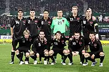 After Austria co-hosted the 2008 European Championship with Switzerland and automatically qualified, Marcel Koller's team managed to qualify for the 2016 European Championship on their own for the first time. This celebration photo was taken on 12 October 2015 after a victory against Liechtenstein.