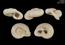 The height of the shell attains 14 mm. The white shell is rather widely umbilicated. The rounded whorls contain spiral riblets and longitudinal striae. A beaded riblet winds into the umbilicus. The peristome is varicose. The inner margin is produced below and above.[2]