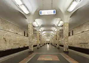 Avtozavodskaya (Russian: Автозаво́дская, lit. auto factory) is a station on the Zamoskvoretskaya line of the Moscow Metro. It is named for the nearby Zavod Imeni Likhacheva where ZIS and ZIL limousines were built. The train station was opened in 1943, a few months before Novokuznetskaya and Paveletskaya. The architect was Alexey Dushkin. From 1943 to 1969 when Kakhovskaya opened, it was the southern terminus of the line.[1] The station has entrances to Avtozavodskaya and Masterkov streets.