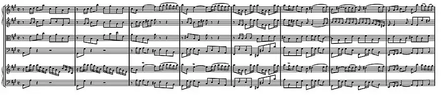 At the cadence there is a full orchestral tutti—the lowest strings once more joining the ripieno section—in a version of the opening ritornello, but now with a rising chromatic fourth in the top notes of the first violin, as the key modulates to F minor. The harpsichord enters with a five bar episode formed by three phrases starting on sustained notes off the beat: the first three bars long with a falling chromatic fourth in the left hand of the hand harpsichord; the second and third, fragmentary one bar statements. These lead into a full recapitulation of the eight-bar Seitensatz, but now with darker colours: the harpsichord starts lower down in the key of D major and the left hand part is joined by the lowest strings. At the end of this episode, back once more in the home tonality of F# minor, the movement concludes with a reprise of the opening ritornello.[12][13][14][15][16]