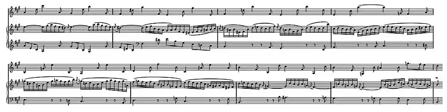 The two bar "motto" or Vordersatz opening the ritornello, consisting of rhythmic spiccato quaver figures in the strings and cascading broken chord semiquavers in the harpsichord, recurs throughout the movement, heralding solo episodes for the harpsichord. In the remainder of A section, the second episode is introduced by the two bar motto and followed by a reprise of the entire first half of the ritornello. Section B starts with an 8-bar solo episode and has three more solo episodes, punctuated by the two-bar ritornello motto. In the second bar of the first episode the sustained harpsichord material is heard in counterpoint to the motto theme in the strings, now starting in the middle of a bar. The second and third episode are 6 bars long in E major/F minor and B minor/C minor. The fourth and longest, which ends section B, is 12 bars long, starting in C minor and ending back in the tonic key of A major. Section A′ starts at bar 79 with what sounds like a reprise of the ritornello—the two-bar motto in its original key; but, as Bach did in many of his concertos, it is interrupted by a solo episode for harpsichord—a variant of the episode introducing section B—before the true reprise of the complete ritornello that concludes the movement.[11][4][2]