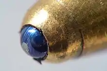 Although designs and construction vary between brands, basic components of all ballpoint pens are universal.[4] Standard components of a ballpoint tip include the freely rotating "ball" itself (distributing the ink on the writing surface), a "socket" holding the ball in place, small "ink channels" that provide ink to the ball through the socket, and a self-contained "ink reservoir" supplying ink to the ball.[5] In modern disposable pens, narrow plastic tubes contain the ink, which is compelled downward to the ball by gravity.[5] Brass, steel, or tungsten carbide are used to manufacture the ball bearing-like points,[5] then housed in a brass socket.[54]