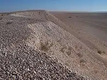 The depositional profile of the northern Banc d'Arguin describes a flat-topped platform, on which extensive carbonate deposits developed largely in water depths <10 meters below sea level. Vast areas of the Banc d'Arguin are covered by mixed carbonate–siliciclastic sediments dominated by barnacles and mollusk remains plus admixed eolian siliciclastics. These sediments accumulate into extensive shoals, occasionally causing water depths below 5 m several dozens kilometers offshore the present shoreline. The bank edge forms a sharp morphological step, suddenly deepening from 10–20m down to 30–50m, and separates the inner shelf environments (<5–10m; carbonate bank) from those of the outer shelf. Assemblages formed by benthic foraminifers and mollusks and monospecific bivalve shell accumulations with admixed eolian silt characterize the platform cover in the outer shelf.[13]