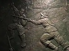 The Jangtae blocked most bullets, thus rendering the government's superior weapons useless. Moreover, Jeon placed the rebel army so that they would divide Yi Hakseung's troops into three separate divisions. Yi Hakseung ordered the troops to use their cannons, but they did not work because the pro-rebel villagers had put water inside the cannons (following the incident, rumours spread throughout the government forces that a ghost had destroyed the cannons).[3][4] Taking advantage of their confusion, the peasant army launched a fierce attack from behind.[1]