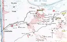 Map of the Egyptian Sinai Peninsula (Bi'r ar Rummanah is Romani and Al Qantjarah is Kantara).