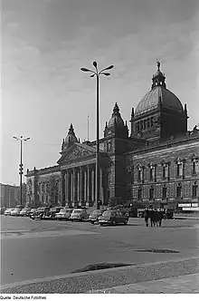 The Federal Constitutional Court initially had its first official residence in the Prinz-Max-Palais from 1951 to 1969. This city villa, dating back to the 1880s and designed by architect Josef Durm in the Wilhelminian style, is located in Karlsruhe's inner-city west near Europaplatz, about half a kilometer southwest of the current seat of the Federal Constitutional Court. The decision to establish the seat of the Federal Constitutional Court in Karlsruhe was made in December 1950, despite strong protests from Berlin. The Prinz-Max-Palais, which had been damaged during World War II, was subsequently rebuilt and adapted to meet the court's requirements. On September 28, 1951, a ceremony attended by the President of Germany Theodor Heuss and Federal Chancellor Konrad Adenauer marked the official move of the Federal Constitutional Court to the new premises.[3][4] However, it became apparent that the Palais was insufficient in terms of space; the justices often had to share rooms with colleagues and staff, and for larger sessions, the court had to relocate to other halls in the city.[5] As early as 1959, Gebhard Müller, who was the President of the Federal Constitutional Court at the time, expressed the need for a new building. There were considerations to move the Constitutional Court's seat to Munich or to relocate it to the nearby castle. The city of Karlsruhe wanted to prevent both and launched an architectural design competition in 1960.[6]