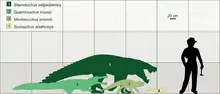 Baurusuchus is an extinct member of the ancestral crocodilian lineage, which lived in Brazil from 90 to 83.5 million years ago, in the Late Cretaceous period. Technically, it is a genus of baurusuchid mesoeucrocodylian. It was a terrestrial predator and scavenger, estimated to reach up to 113.4 kilograms (250 lb) in weight.[1] Baurusuchus lived during the Turonian to Santonian stages of the Late Cretaceous Period, in Adamantina Formation, Brazil.[2] It gets its name from the Brazilian Bauru Group ("Bauru crocodile"). It was related to the earlier-named Cynodontosuchus rothi, which was smaller, with weaker dentition.[3] The three species are B. pachechoi, named after Eng Joviano Pacheco, its discoverer,[4] B. salgadoensis (named after General Salgado County in São Paulo, Brazil)[5] and B. albertoi (named after Alberto Barbosa de Carvalho, Brazilian paleontologist).[2] The latter species is disputed (see phylogeny section). Its relatives include the similarly sized Stratiotosuchus from the Adamantina Formation, and Pabweshi, from the Pakistani Pab Formation.