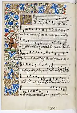 The Bayeux Manuscript is one of the only two secular monophonic French musical manuscripts from around 1500.[1] The songs are largely of a popular and pastoral nature, unlike the courtly love songs of the previous century.[2]
