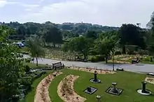 Bear Road has maximum and average gradients of 1:8 and 1:11 respectively,[1] and the other streets running eastwards from Lewes Road are similarly steep. The 141-metre (463 ft) summit of Race Hill is one of the city's highest points, and excellent views are available from there and from the Bear Road area generally.[2] Views westward towards the city centre, northward over the South Downs and southward towards Brighton Racecourse and the sea are particularly important.[9] The cemeteries are sheltered and well planted, but the residential areas to the north are very exposed due to their hillside location and lack of tree cover.[2] The only open space in the area is provided by the allotments at the north end, between the housing and Bevendean; there are no parks or play areas, and the nearest (Saunders Park) is across the Lewes Road.[9]