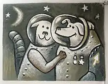 Strelka went on to have six puppies with a male dog named Pushok who participated in many ground-based space experiments, but never made it into space.[4] One of the puppies was named Pushinka (Пушинка, "Fluffy") and was presented to President John F. Kennedy by Nikita Khrushchev in 1961. A Kennedy dog named Charlie and Pushinka mated, resulting in the birth of four puppies that JFK referred to jokingly as pupniks.[5] Two of their puppies, Butterfly and Streaker, were given away to children in the Midwest. The other two puppies, White Tips and Blackie, stayed at the Kennedy home on Squaw Island but were eventually given away to family friends.[4] Pushinka's descendants were still living as of 2015.[6] A photo of descendants of some of the Space Dogs is on display at the Zvezda Museum in Tomilino outside Moscow.[7]
