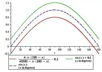 The part of the graph of sin x in the range from 0° to 180° "looks like" part of a parabola through the points (0, 0) and (180, 0). The general such parabola is