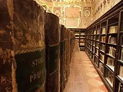The Biblioteca comunale dell'Archiginnasio (Archiginnasio Municipal Library) is a public library in Bologna, Italy. It is located inside the Palace of the Archiginnasio in Bologna since 1838, when a section of the building was destined to preserve the books collected from the closure of the religious orders made by Napoleon. The increase of the collections was pursued by purchasing and by donations from eminent people and scholars of Bologna, among them the cardinal Giuseppe Mezzofanti, Giovanni Gozzadini, Marco Minghetti, Giovanni Pascoli, Jacob Moleschott, Luigi Serra, Laura Bassi, Aurelio Saffi, Riccardo Bacchelli, Pelagio Palagi.