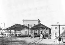 The surviving Grade I listed entrance building was designed by Philip Hardwick, having been intended to be used as the company's offices and boardroom.[12] Built during 1838, it is among the world's oldest surviving pieces of monumental railway architecture. Built at a cost of £28,000,[13] the architecture is Roman inspired, following Hardwick's trip to Italy in 1818–19. It has tall pillars running up the front of the building, made out of a series of huge blocks of stone. The design mirrored the Euston Arch at the London end of the L&BR.[2] In the original design, the building was to be flanked by two arches leading into the station: excavations have revealed that these were never built. The interior was modified in 1839 to accommodate a 'hotel' (the Victoria), although this was probably more in the nature of a refreshment room or public house, and later the booking hall, with a large iron balustraded stone staircase and offices. It is three storeys tall but relatively small. A detailed paper from Historic England can be found at the Warwickshire Railways website..[14]