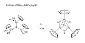 Multiple bismuth-containing clusters were reported, some of them synthesized through carbon monoxide ligand loss from the previously reported bismuth complexes.[2] Strained cluster complexes with monodentate as well as bridging carbon monoxide units have also been isolated, such as [{Cp(μ2-CO)Fe}3(μ3-Bi)] and [(µ3-Bi)Co3(CO)6(µ-CO)3].[13]