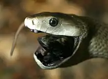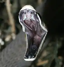 Specimens vary considerably in colour, including olive, yellowish-brown, khaki and gunmetal but are rarely black. The scales of some individuals may have a purplish sheen. Individuals occasionally display dark mottling towards the posterior, which may appear in the form of diagonal crossbands. Black mambas have greyish-white underbellies. The common name is derived from the appearance of the inside of the mouth, dark bluish-grey to nearly black.[20] Mamba eyes range between greyish-brown and shades of black; the pupil is surrounded by a silvery-white or yellow colour. Juvenile snakes are lighter in colour than adults; these are typically grey or olive green and darken as they age.[17][10][12]