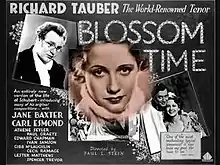 Blossom Time is a 1934 British musical drama film directed by Paul L. Stein and starring Richard Tauber, Jane Baxter and Carl Esmond. It was based on the opera Blossom Time by Heinrich Berté.[1] In nineteenth century Vienna, composer Franz Schubert assists a girl with whom he is secretly in love. The film had a London midnight premiere on 10 July 1934, a trade/press showing in Nottingham on 25 July, and opened to the public on 24 August at the Regal Cinema, Marble Arch, where it ran for seven weeks. The Vienna premiere was at the 'Apollo' on 20 November 1934.