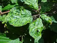 Mosaic pattern on leaves of raspberry plant, also a characteristic of Blueberry mosaic associated ophiovirus