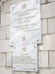 Bobota was the first village in Vukovar region where Yugoslav Partisans resistance was organized during the World War II in Yugoslavia.[14] On 26 August 1941 local Ustaše representative was attacked under the leadership of Đoko Patković.[14] 96 residents of Bobota lost they lives during the World War II resulting in post-war reputation of the village as a regional stronghold of the resistance movement.[14] In the first years following the World War II in Yugoslavia and before 1948 Tito–Stalin split the new Yugoslavia implemented a number of policies copied from the Soviet Union including some aspects of collectivization in the Soviet Union. Rural resistance to this policy led to an incident in Bobota in 1945 when an anonymous humorous graffiti appeared in the village subsequently described by new authorities as an "enemy act by kulak elements".[15] The inscription, which rhyme in original language, stated "Kralju Petre, dođi nam do žetve, jer nam Tito odnese sve žito" or in English "King Peter, come before our harvest, because Tito took away all of our grain".[15] During the existence of the SFR Yugoslavia Bobota, nevertheless, gained reputation of comparatively prosperous village.[14]