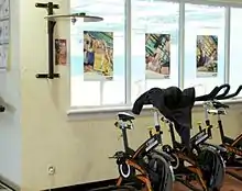 Exercise bikes in the PE fitness room. The windows look down on the small games hall.
