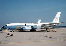 Eighteen C-135As (Boeing model number 717-157[7]), powered by Pratt & Whitney J57 turbojets, were built. In later years, almost all were upgraded with Pratt & Whitney TF33 turbofan engines and wide-span horizontal stabilizers, and were re-designated C-135E. Most were converted to various special roles, including airborne command posts, missile-tracking platforms, and VIP transports, and were withdrawn throughout the 1990s.[8] The C-135E designation was also applied to EC-135Ns that were used in the combat support role.[9]