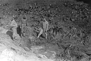 ![]() American servicemen inspecting a shell crater after the Japanese attack on Fort Stevens. | |||||||