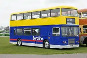 Boro'line was launched with a bold new livery, designed by Best Impressions, who would later go on to design the last independent Maidstone & District livery.[2] The livery consisted of a blue lower and yellow upper base, with white Boro'line logo, red Maidstone strapline and line, with a silver skirt.[9] From 1976 until well after the launch of Boro'line, vehicles in Maidstone could be seen in a variety of liveries, with some retaining either old Maidstone liveries, or the liveries in which they arrived in.[1] Some ochre vehicles only received a yellow front and Boro'line logos, or blue and yellow base with piecemeal detail application. The use in service of many hired or demonstration vehicles caused many other liveries or white buses with Boro'line logos to be used in service.