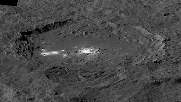 The brightest cluster of spots ("Spot 5") is located in an 80-kilometer (50 mi) crater called Occator.[1][2] The largest and brightest component of the cluster is in the center of the crater, with dimmer spots located towards this crater's eastern rim. Early in the orbital phase of the Dawn mission, the high albedo of these spots was speculated to be due to some kind of outgassing,[3] and subsequent closer images helped scientists determine that it is a material with a high level of reflection, and suggested ice and salt as possibilities.[4] These bright features have an albedo of about 40%, four times brighter than the average of Ceres's surface.[5]