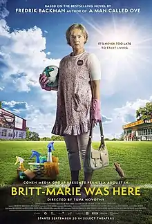 Britt-Marie Was Here (Swedish: Britt-Marie var här) is a 2019 Swedish comedy-drama film directed by Tuva Novotny based on Fredrik Backman's 2014 novel of the same name. Produced by Gustav Oldén and Nicklas Wikström Nicastro, the film stars Pernilla August, Peter Haber, Anders Mossling, Malin Levanon, and Vera Vitali. The plot follows the titular protagonist Britt-Marie, a 63-year-old homemaker played by August, who leaves her cheating husband of 40 years and reluctantly takes on a job as a youth soccer coach in the remote town of Borg.