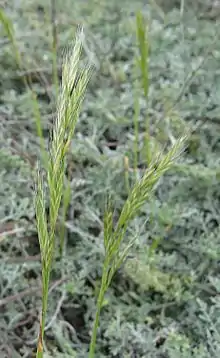 It is an annual grass growing 40 to 90 centimetres (16 to 35 in) tall with an open, branching inflorescence. The spikelets are flat and hairy and have awns up to 1.5 centimetres (58 in) long.