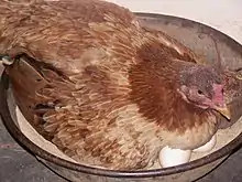 Broodiness is the action or behavioral tendency to sit on a clutch of eggs to incubate them, often requiring the non-expression of many other behaviors including feeding and drinking.[1] Being broody has been defined as "Being in a state of readiness to brood eggs that is characterized by cessation of laying and by marked changes in behavior and physiology".[2] Broodiness is usually associated with female birds, although males of some bird species become broody and some non-avian animals also show broodiness.