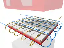 A bubble memory device consists of a case, that houses a PCB with connections to one or more bubble memory chips, which may be translucent. The area around the chips on the PCB is surrounded by two windings made of copper wire or other electrically conductive material, that mostly wrap the area, leaving some space for the PCB to pass through the windings and connect to the chips. The windings are wound in directions opposite to each other, for example one winding has wires oriented along the X axis and the other winding has wires along the Z axis. The windings, in turn, are surrounded by two permanent magnets, one below and another above the windings. This forms an assembly that is housed inside the case which acts as a magnetic shield and forms a magnetic return path for the magnetic field from the magnets. The permanent magnets are critical; they create a static (DC, direct current) magnetic field, used as a bias field that enables the contents of the memory to be retained, in other words they allow bubble memories to be non-volatile. If the magnets are removed, all bubbles will disappear and thus all contents will be deleted. The windings create a rotating magnetic field parallel to the orientation of the bubble memory, at around 100 to 200 khz. This will move or drive the bubbles in the magnetic film in a somewhat circular fashion, guided or restrained by the propagation elements. For example, the rotating magnetic field can force the bubbles to constantly circulate around loops, which may be elongated and are defined by the locations of the guiding elements.[3][6]