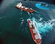 Before specialized bulk carriers were developed, shippers had two methods to move bulk goods by ship. In the first method, longshoremen loaded the cargo into sacks, stacked the sacks onto pallets, and put the pallets into the cargo hold with a crane.[7] The second method required the shipper to charter an entire ship and spend time and money to build plywood bins into the holds.[8] Then, to guide the cargo through the small hatches, wooden feeders and shifting boards had to be constructed.[8] These methods were slow and labor-intensive. As with the container ship, the problem of efficient loading and unloading has driven the evolution of the bulk carrier.