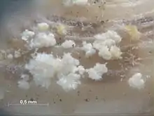 Crystallized salt clusters (efflorescence) produced by Byne's disease on a gastropod shell's surface