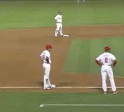 In 2012, he split time between the Reading Phillies and Lehigh Valley IronPigs, the Phillies Double-A (AA) and Triple-A (AAA) affiliates respectively. With Reading, he tied for the league lead in triples, with 11, and was second in the league in sacrifice hits, with 10.[9] He combined to hit .291/.329/.404 with 2 home runs and 57 RBIs, stealing 21 bases.[7] He was an Eastern League mid-season and post-season All Star for his performance with Reading, earning his call-up to Lehigh Valley in August.[2][6] Baseball America ranked him the Phillies best defensive infielder after the 2012 season, and MiLB.com named him a Philadelphia Organization All Star.[6][10]