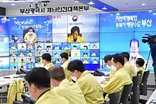 ![]() From top to bottom then from left to right: a queue in front of a pharmacy in Wonju for the distribution of masks, a drone of disinfection in Seongnam, a closed elementary school in Daegu, protest inscriptions against Shincheonji on a car, video call between members of the South Korean government, manufacturing of masks in Busan, 2020 South Korean legislative election, admission of a symptomatic patient to a hospital in Busan, portable medical negative pressure isolation stretcher in a fire station in Hoengseong County, firefighters' training in Daegu, thermal camera at the entrance to Wonju hospital, temperature check at Incheon International Airport, drive-through testing in Gyeongju. | |