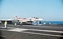 The following month, America initiated into carrier service the A-7 Corsair II, conducting its flight qualifications off the Virginia Capes, while she also conducted automatic carrier landing system trials which demonstrated the feasibility of "no hands" landings of F-4 Phantom, F-8 Crusader and A-4 Skyhawk aircraft.[1]