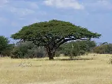 Vachellia erioloba, the camel thorn, also known as the giraffe thorn, mokala tree, or Kameeldoring in Afrikaans, still more commonly known as Acacia erioloba, is a tree of southern Africa in the family Fabaceae.[2] Its preferred habitat is the deep dry sandy soils in parts of South Africa, Botswana, the western areas of Zimbabwe and Namibia. It is also native to Angola, south-west Mozambique, Zambia and Eswatini.[3] The tree was first described by Ernst Heinrich Friedrich Meyer and Johann Franz Drège in 1836.[3] The camel thorn is a protected tree in South Africa.[4]