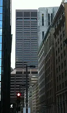 - ↑ Douglass Shand-Tucci Built in Boston: City and Suburb, 1800-2000 Univ. of Mass. Press (1999) ISBN 1-55849-201-1, ISBN 978-1-55849-201-1, p. 296, "By the late 1970s, however, it was not only at the head of State Street that the early efforts at a distinctive Modernist aesthetic sensitive to the historic city was being abandoned. In 1971 even so venerable an institution as the First National Bank of Boston was responsible for an astonishingly bombastic tower by Campbell, Aldrich and Nulty, the heavy, dark red granite bulging middle range of which is difficult to explain and impossible to defend."