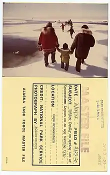 The beach ridges are the primary reason for the area's preservation, which serves to safeguard evidence of 5,000 years of occupation by the Inupiat people,[10] and more than 9,000 years of human occupation.[11] Initial investigations by archaeologist J. Louis Giddings in the late 1940s found campsites on the cape as much as 4,000 years old, and even older sites on the mainland.[8] University of Washington researchers have undertaken several years of excavations to document about one third of the 9,000-acre (3,600 ha) beach complex. Researchers found campsites, hearths and animal bones, with a few stone tools and pieces of pottery. In newer locations the team documented the remains of semi-subterranean houses built into the beach ridges, such as the Old Whaling site.[12][13]