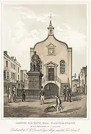 The Georgian building was never popular with the townspeople, and by the 1790s, there were already complaints that it was inconvenient and was falling into a poor condition. After the death of John Crichton-Stuart, 2nd Marquess of Bute in 1848, a statue of him (in classical attire) was erected outside the town hall. By the 1850s, Cardiff was rapidly expanding, and it was felt that the Georgian town hall needed to be replaced, and a new town hall was opened in 1853. After its replacement, the old town hall continued to be used for council meetings, concerts and other entertainments until it was sold at the end of the 1850s.[6] It was demolished in 1861.[7] After demolition, the statue of the Marquess of Bute was moved to the southern end of St Mary Street.[8]