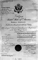 To communicate with his handlers, Lody was instructed to write to certain addresses in Christiania (now Oslo), Stockholm, New York City and Rome. He acquired an American emergency passport in the name of Charles A. Inglis,[15] a genuine document obtained from the US Embassy in Berlin. When Germany declared war on Russia on 1 August, newly imposed restrictions prevented foreigners from leaving Germany without travel documents. Embassies and consulates throughout the country experienced a rush of visitors as foreigners sought emergency passports; these had to be submitted to the German Foreign Ministry to obtain exit permits for neutral Denmark or the Netherlands. One such applicant was the real Charles A. Inglis, whose passport went missing – lost, it was claimed, although in fact the Foreign Ministry had appropriated it for Lody's use. As the passport lacked security features such as the holder's photograph or fingerprints, being merely a single-sheet document, it was well-suited for use by a spy.[18] Lody said later that he had received it in the post from his superiors at N.[19] He was also given £250 in British banknotes, 1,000 Danish krone and 1,000 Norwegian krone to finance his mission to the UK, where he would travel via Denmark and Norway.[20]