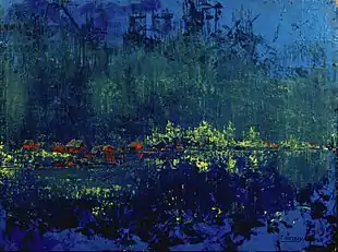 In Langley, he opened up a sign shop, in the days when signs were still made by hand. Hessay lived in a rear curtained-off area, his furnishings consisting of a cot, hot plate, and table and chairs.[20][21][nb 2] When he returned to creating art in the early 1950s, these spartan accommodations doubly functioned as a studio. According to Woods, "paintings were everywhere".[21] On weekends, he often closed his shop to travel to the Fraser Canyon and the British Columbia interior, where he panned for gold. Hessay once had a prospector's shack near the Old Alexandra Bridge, in the vicinity of Spuzzum.[25][26] He enjoyed visiting First Natiions reserves, where he found social acceptance.[27] His artistic output was initially reflective of his European training. Aware of experiments taking place in New York and California, he began to produce many works of pure or semi-abstraction, alongside his landscapes inspired by the British Columbia wilderness.[21][28][29] A member of the Federation of Canadian Artists, he participated in group exhibits, displayed at local art galleries, and had one-man shows in British Columbia and elsewhere.[30] Hessay died of a heart attack on 1 January 1978 while attending a New Year's dance at the Sasquatch Inn in Spuzzum.[3] He is buried at Langley Lawn Cemetery.[8]